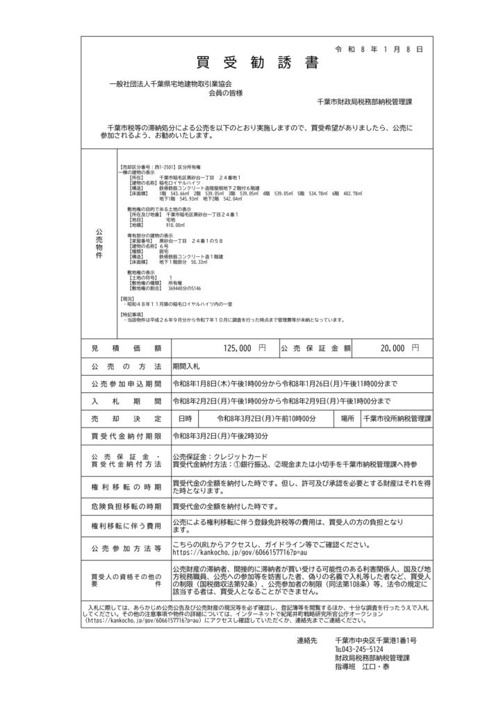 千葉市役所より、インターネットによる不動産公売実施のご案内をいただきましたので、お知らせいたします。