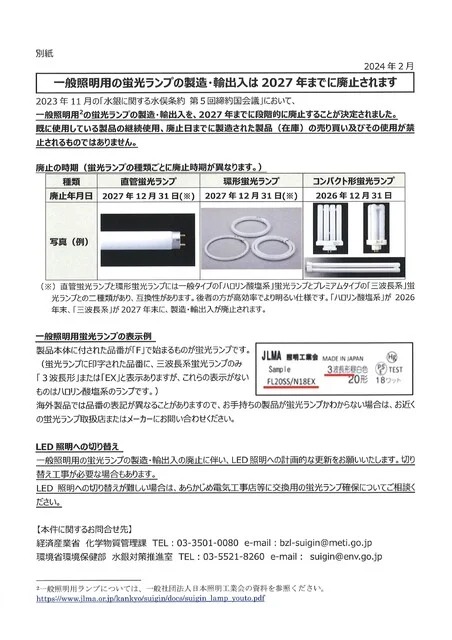 経産省・環境省より、蛍光ランプの製造・輸出入廃止の件について、国土交通省通じて周知依頼がありました。